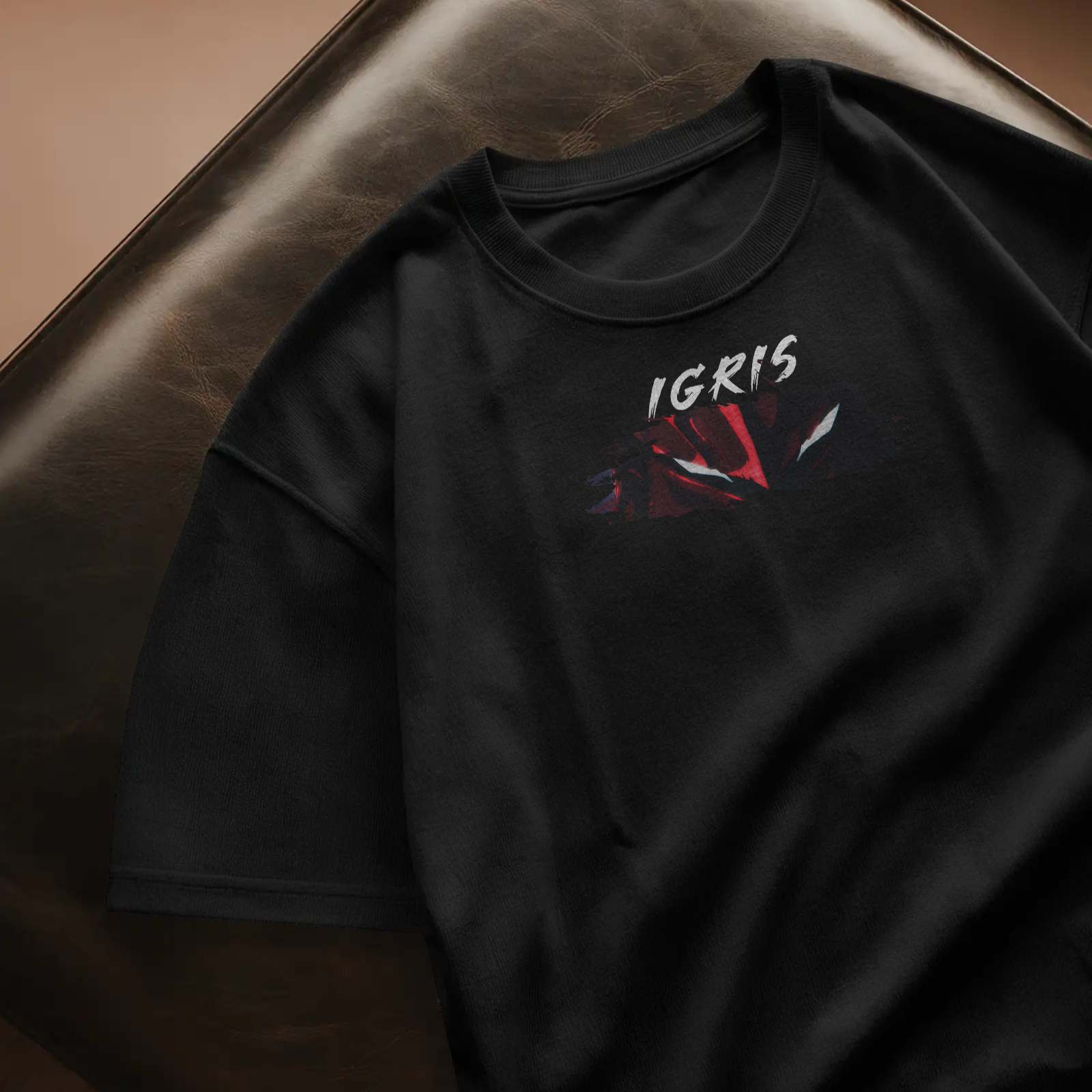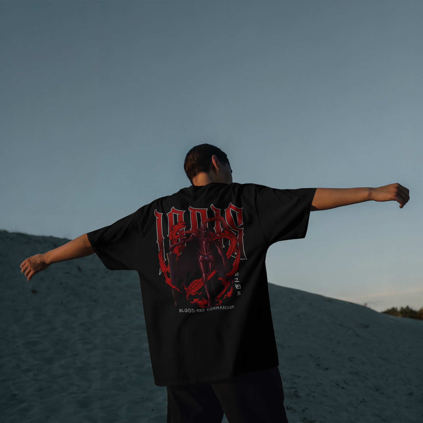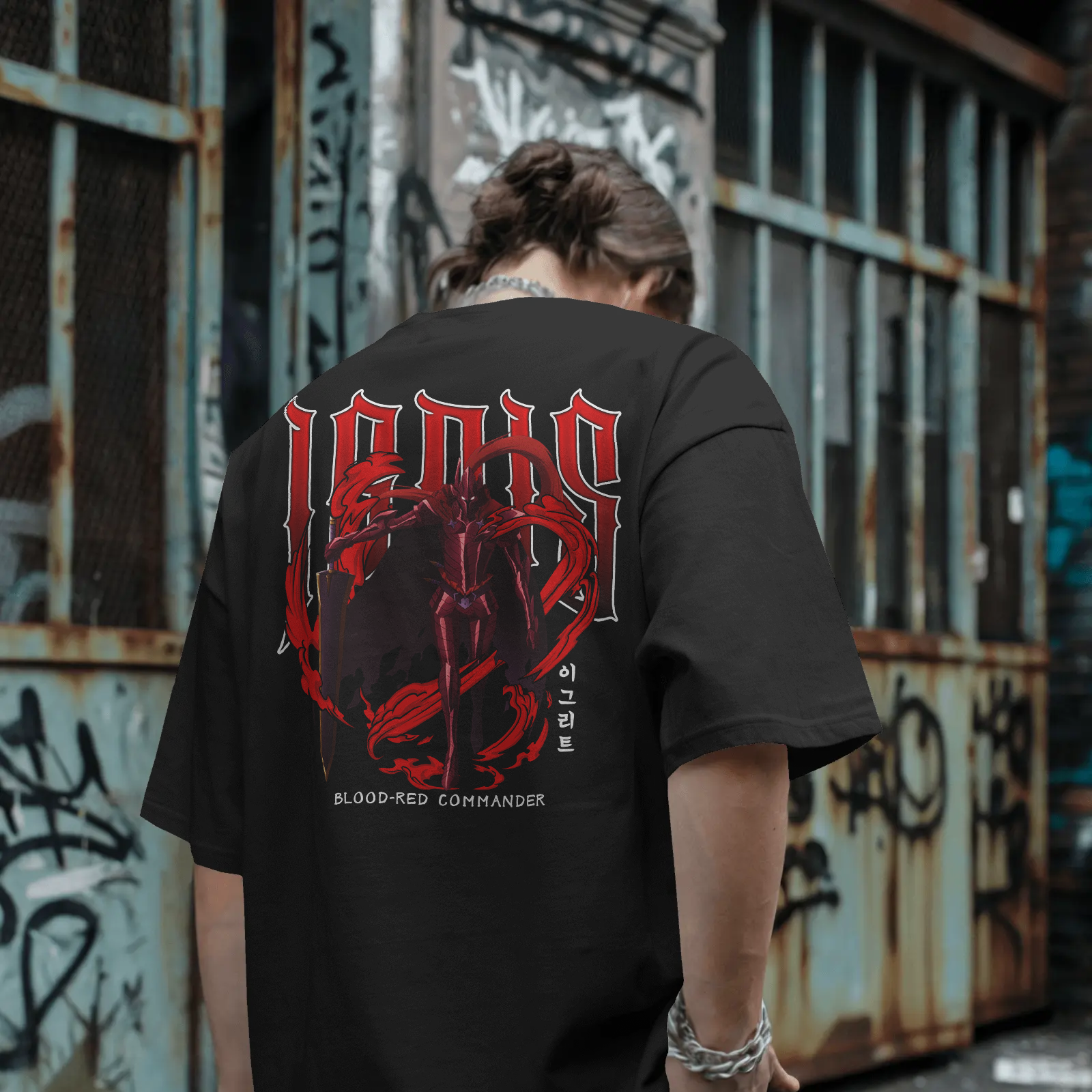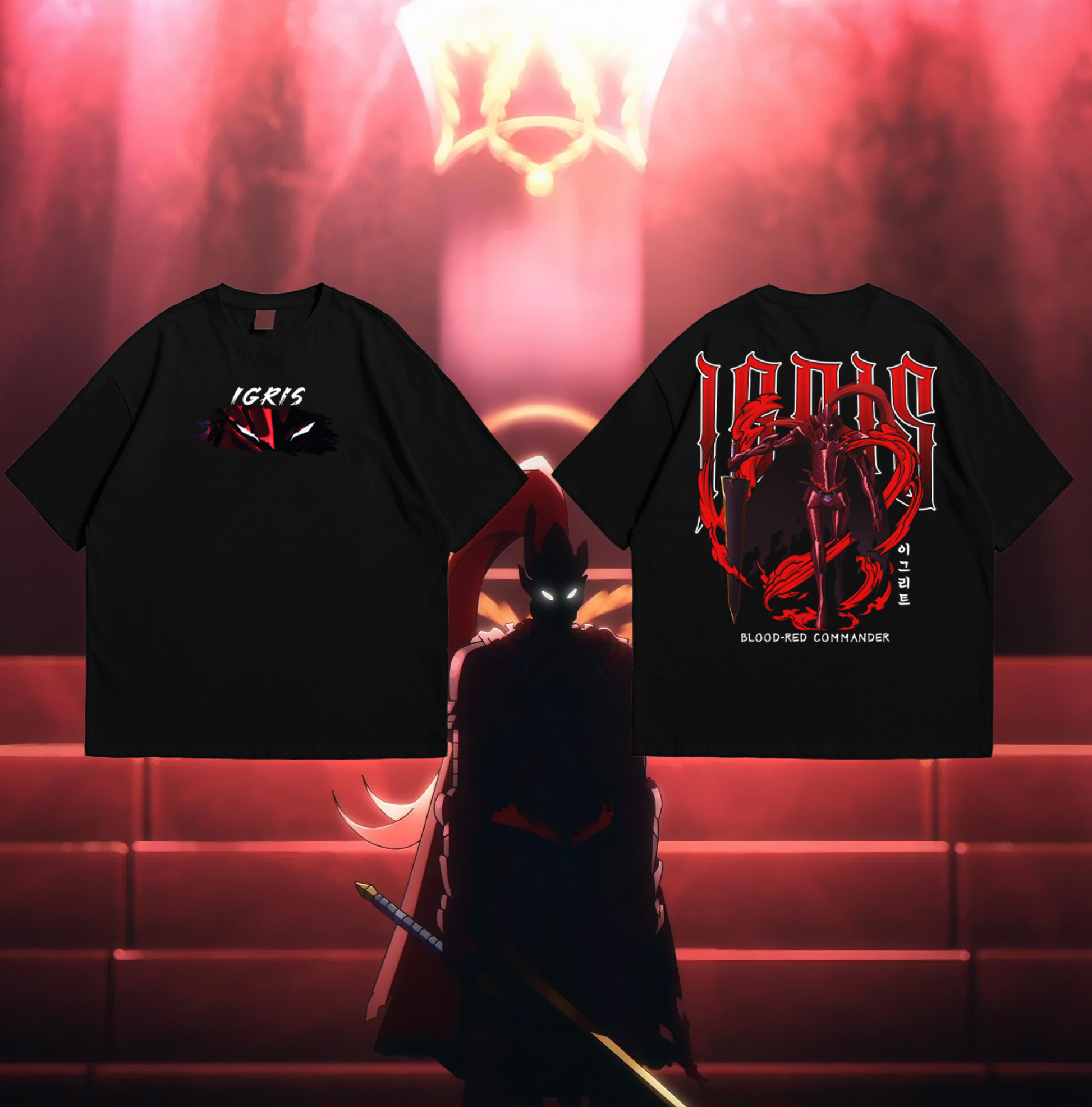This piece immortalizes Igris in his most fearsome form—draped in crimson energy, armor gleaming with infernal power. Front chest print features his piercing eyes watching through the void. The back delivers a full-panel design of the Blood-Red Commander in dynamic, flaming motion.