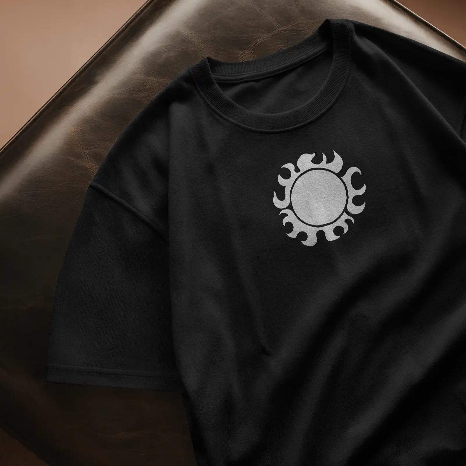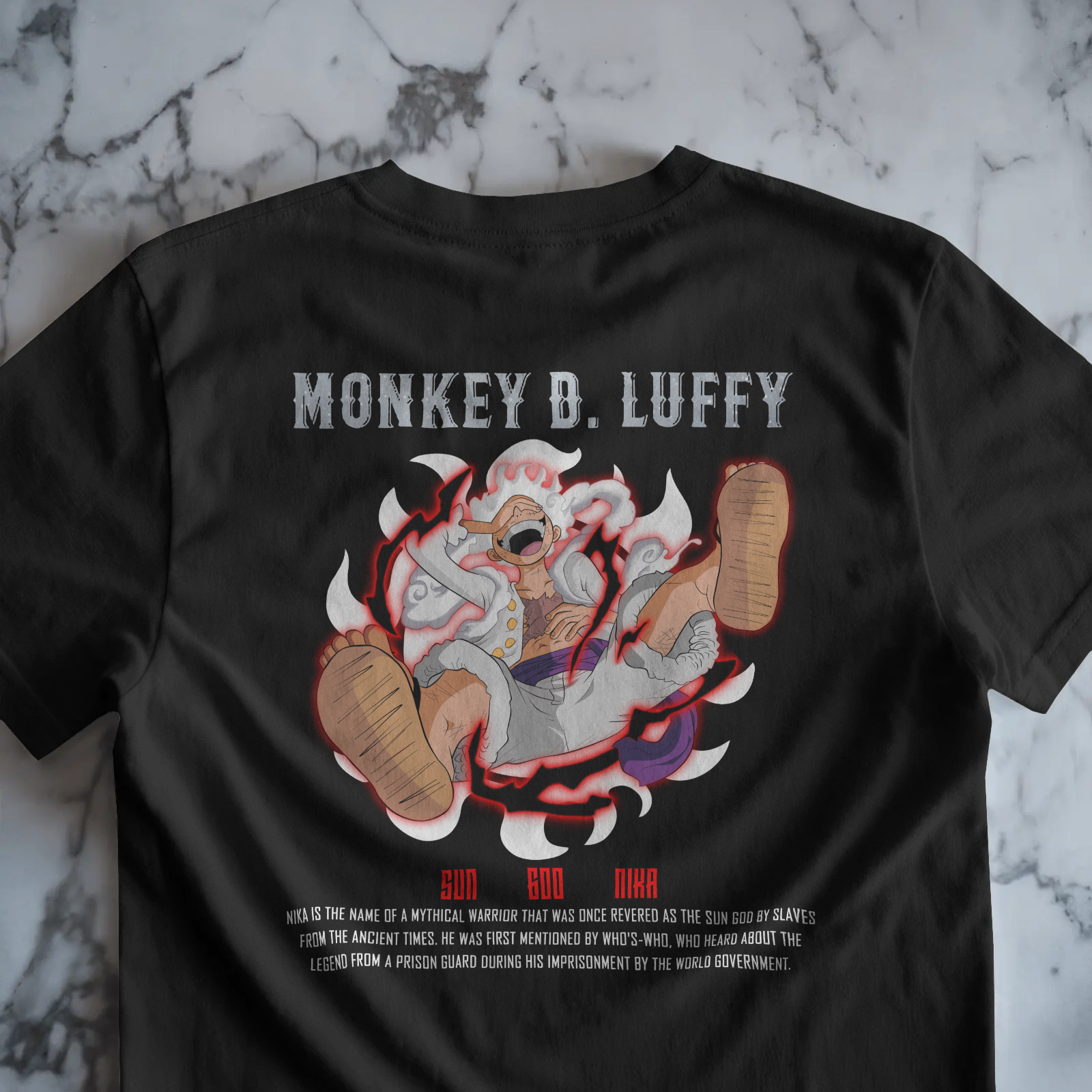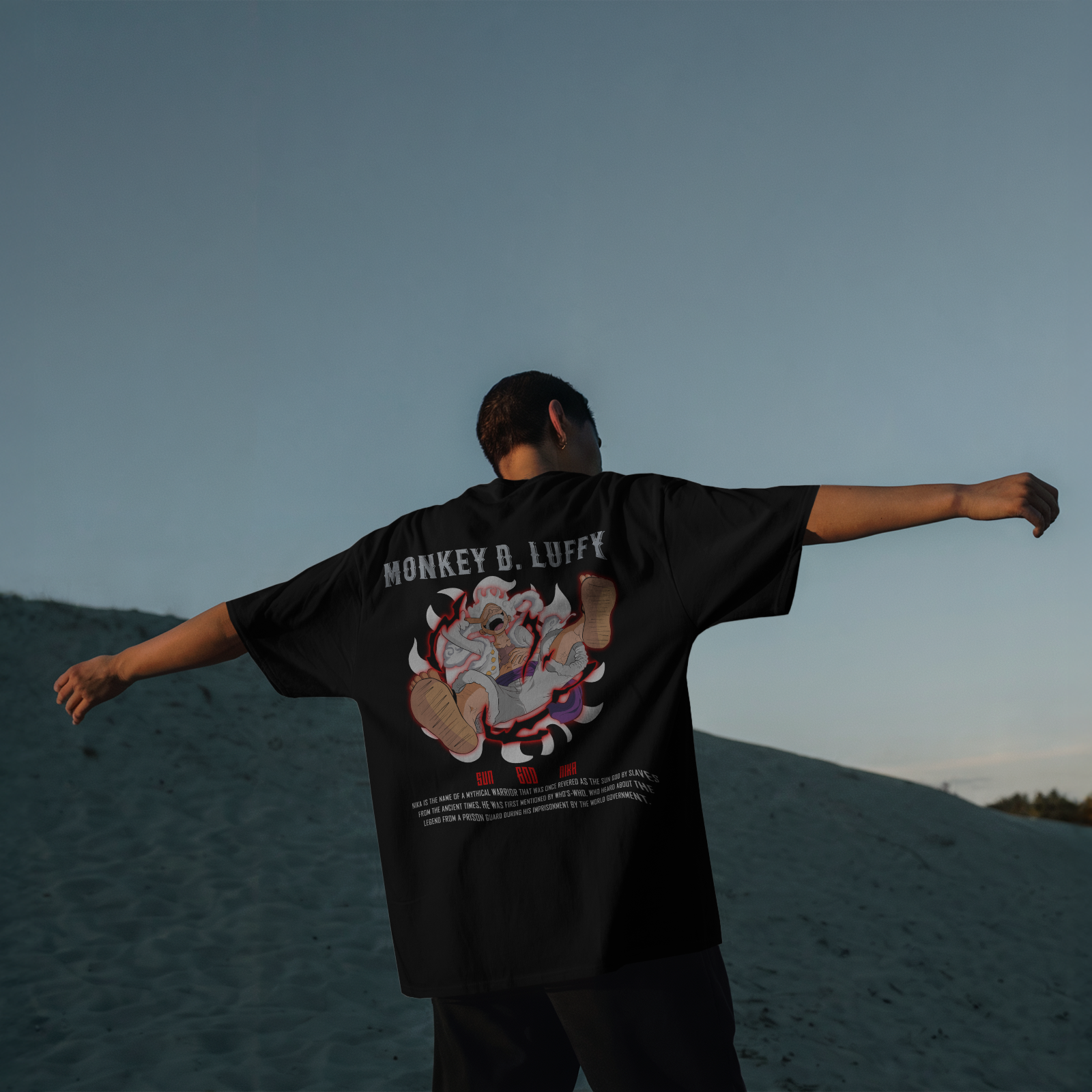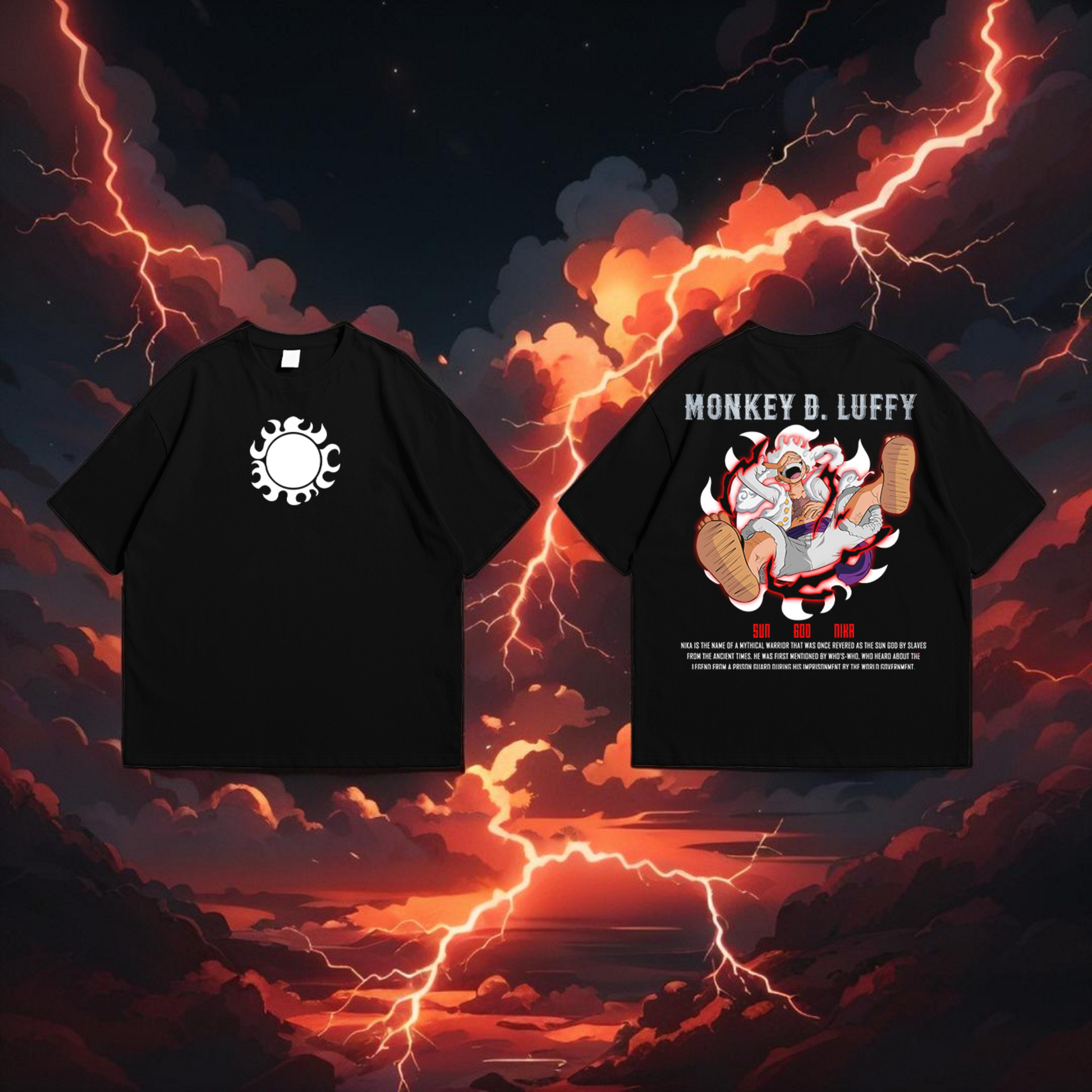 This oversized tee captures Luffy’s mythical transformation into the Sun God Nika, where freedom becomes a force of nature. White lightning crackles around his awakened form, surrounded by divine energy and fluid cartoon motion. It’s not just power — it’s joy. It’s rhythm. It’s rebellion wrapped in a grin.