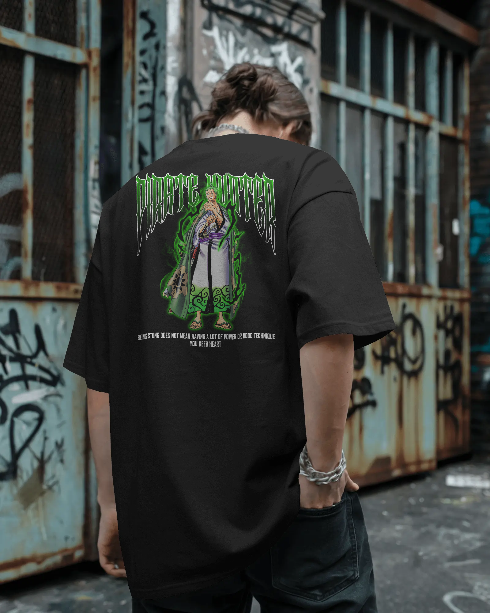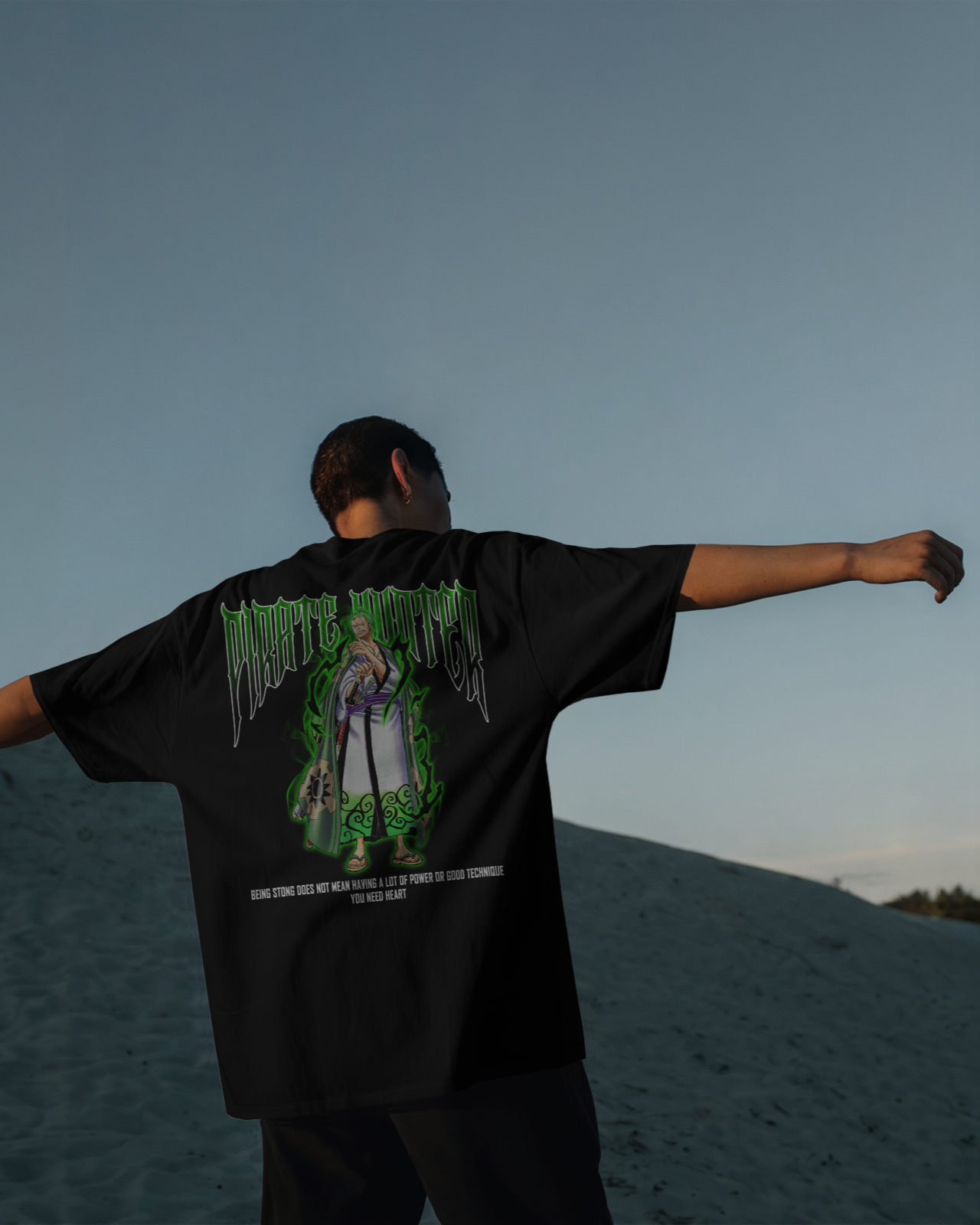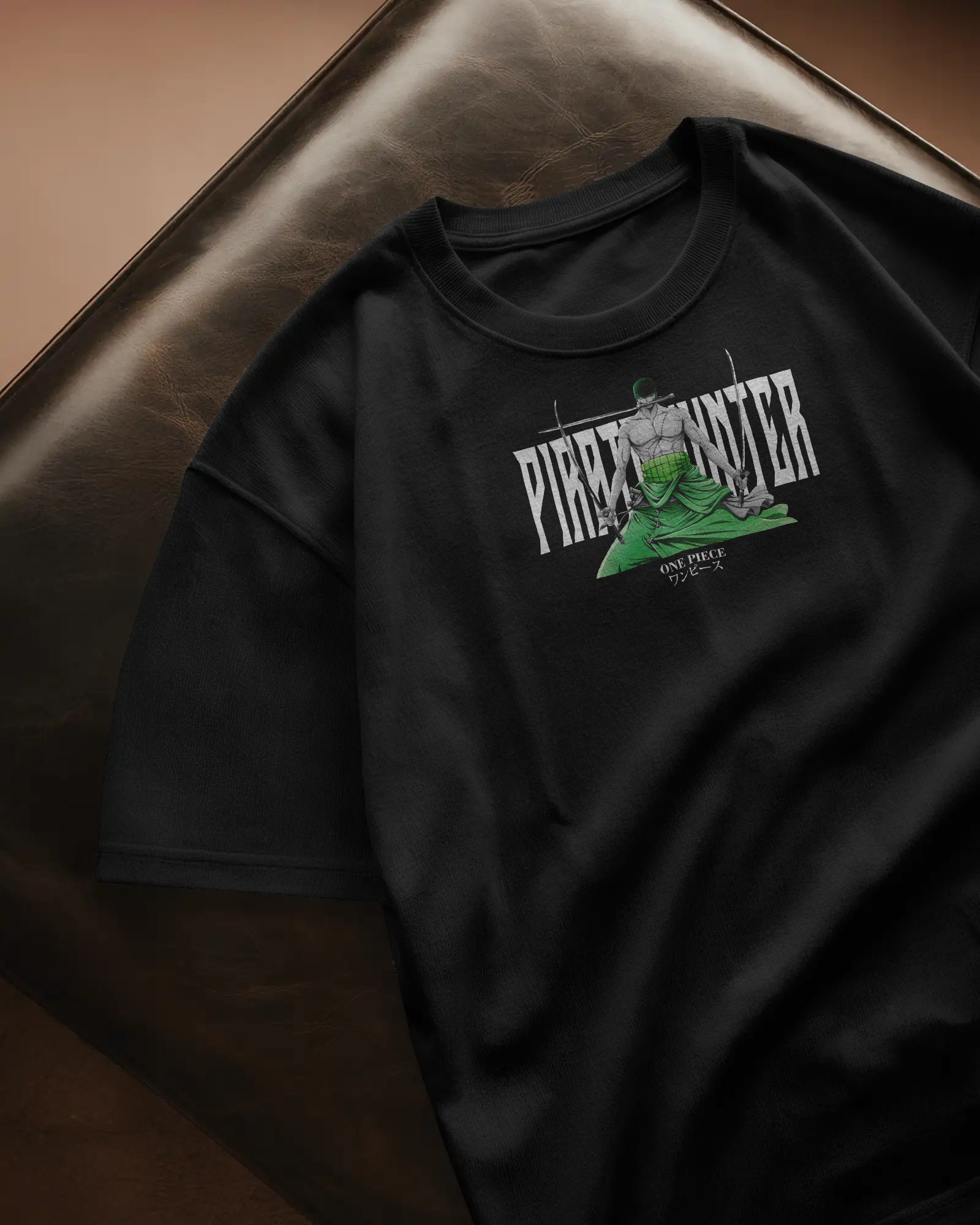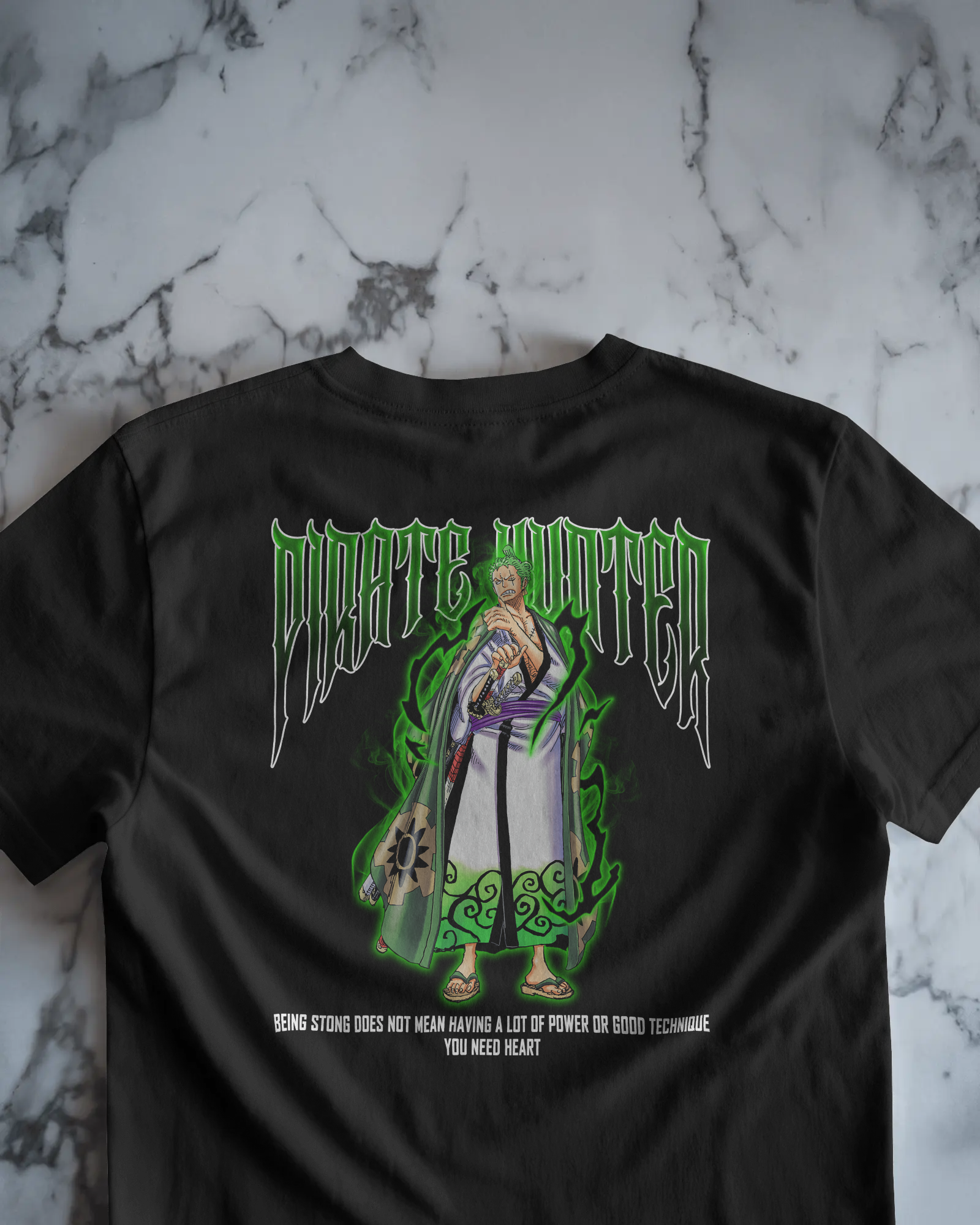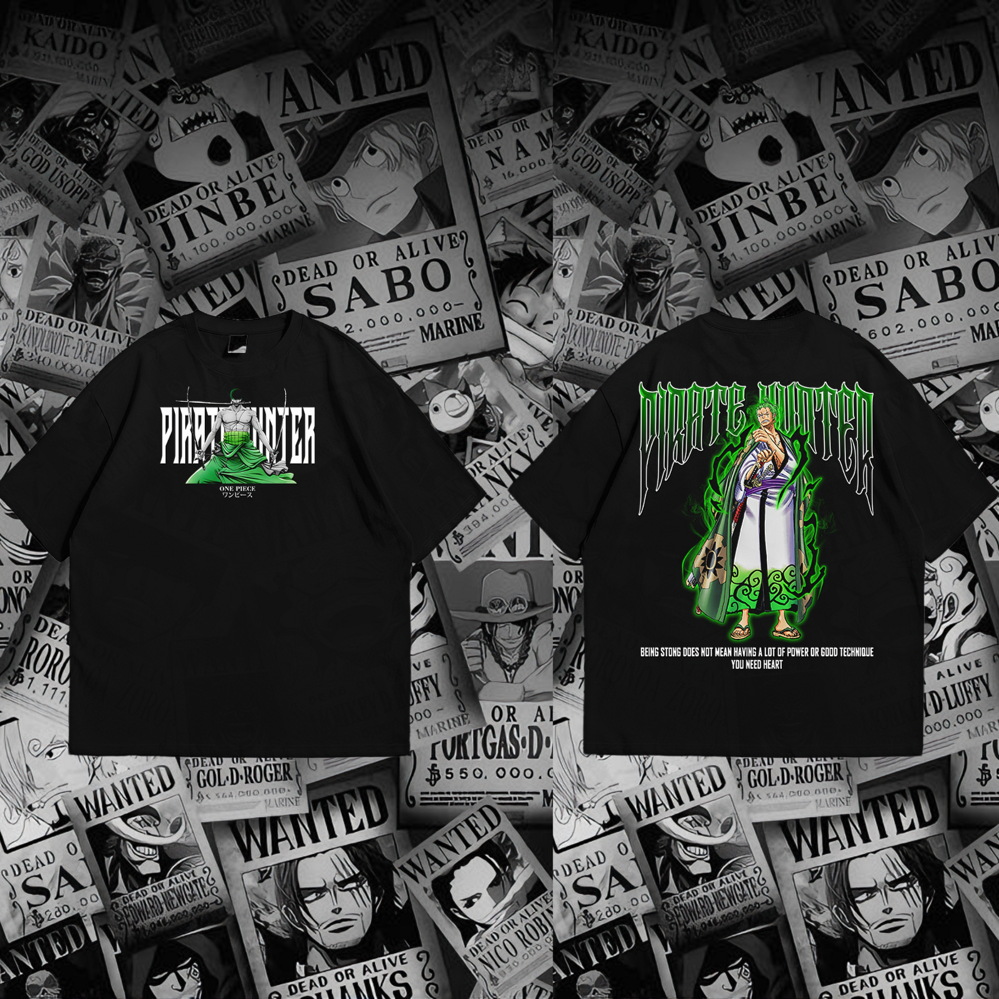 His name is written in blood and bounty. This bold design channels the raw energy of Zoro’s wanted poster come to life — cloaked in cursed green, blood red, and shadow-black. The swords hum with unfinished business. The air crackles with quiet fury.